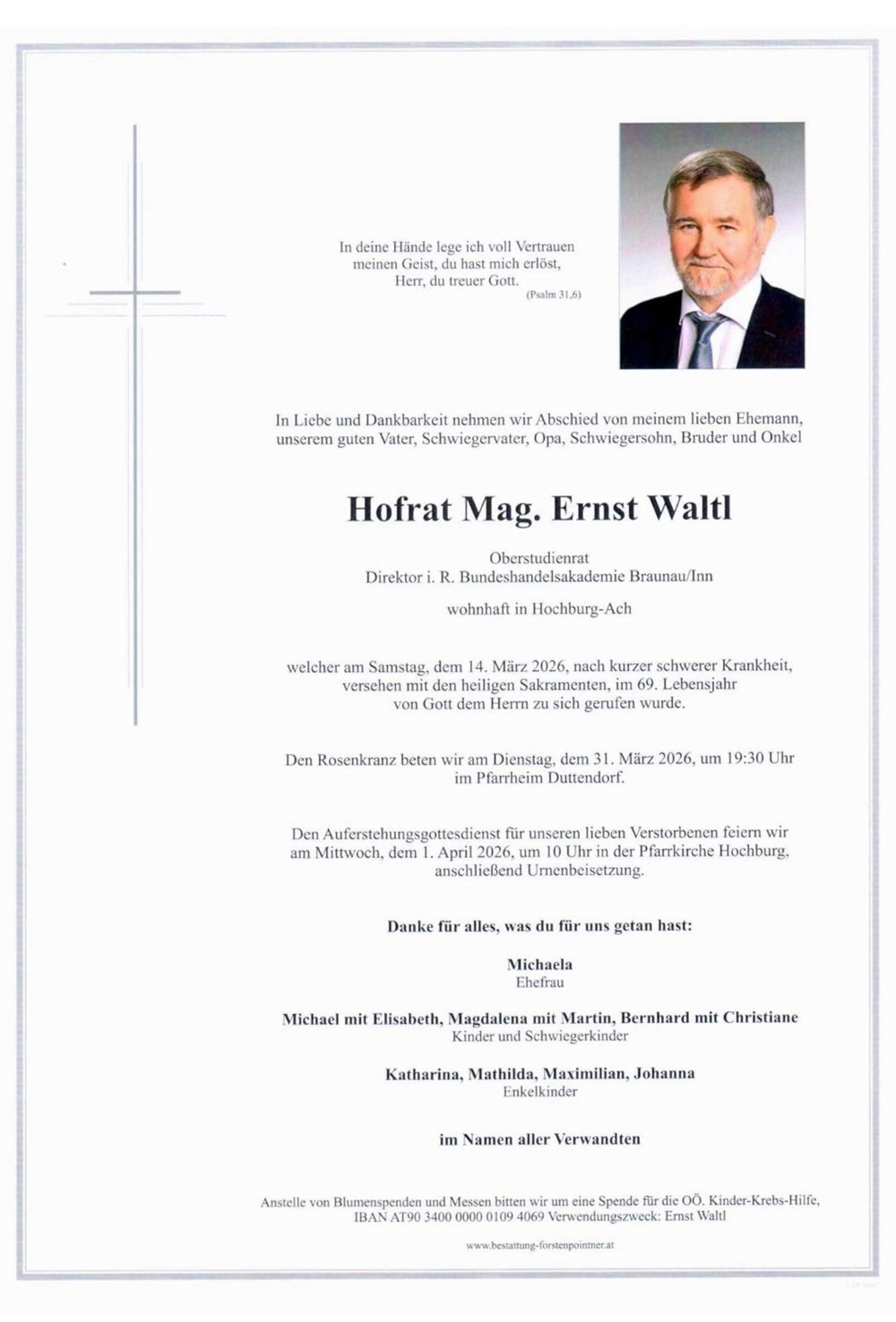Wir trauern um unseren früheren Direktor Hofrat OStR. Mag. Ernst Waltl, der am 14. März viel zu früh von uns gegangen ist.