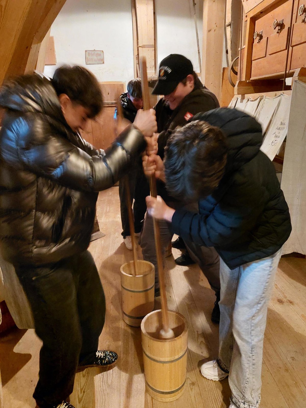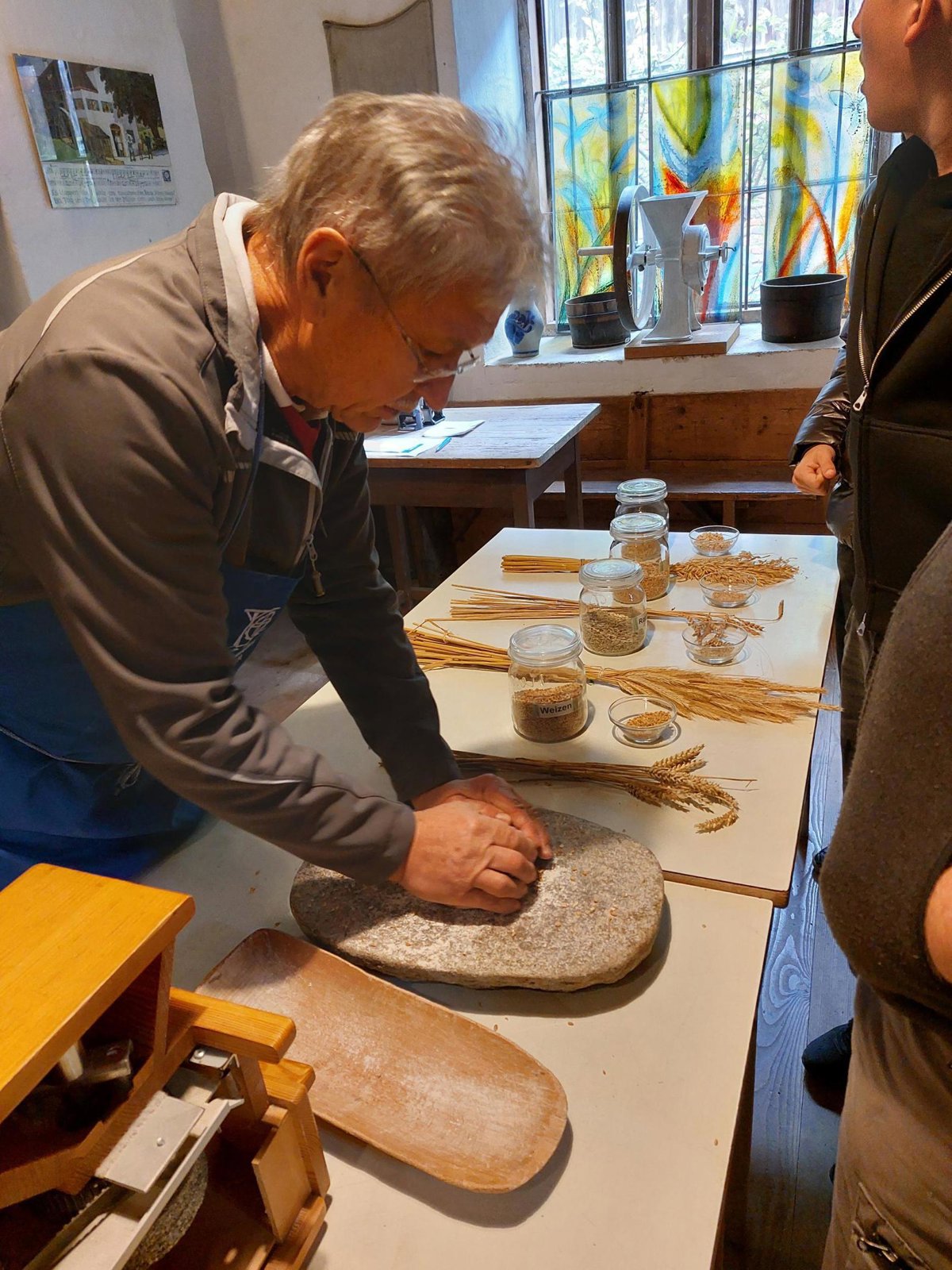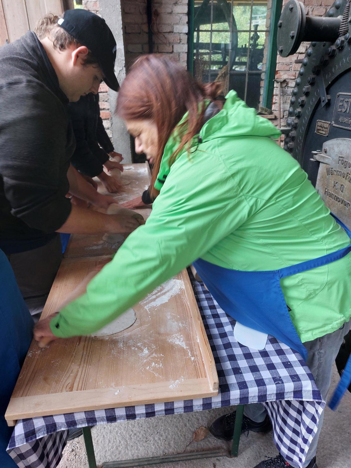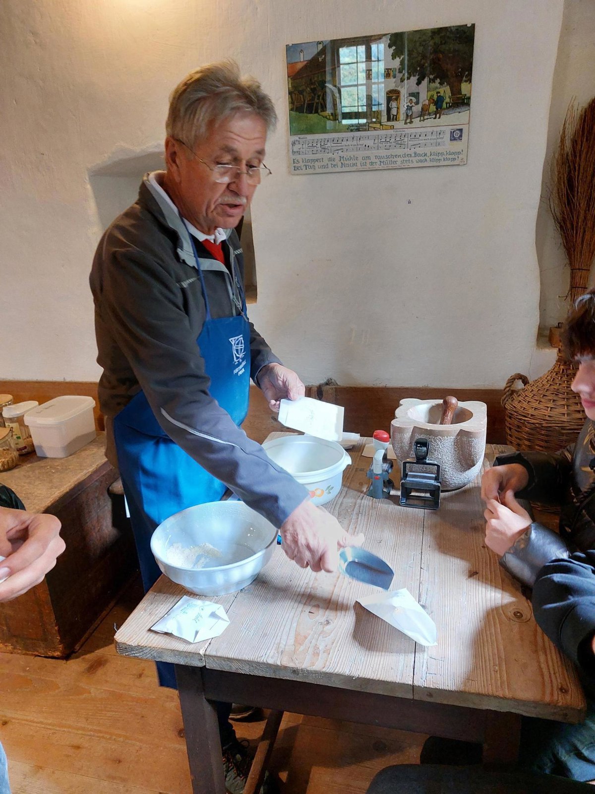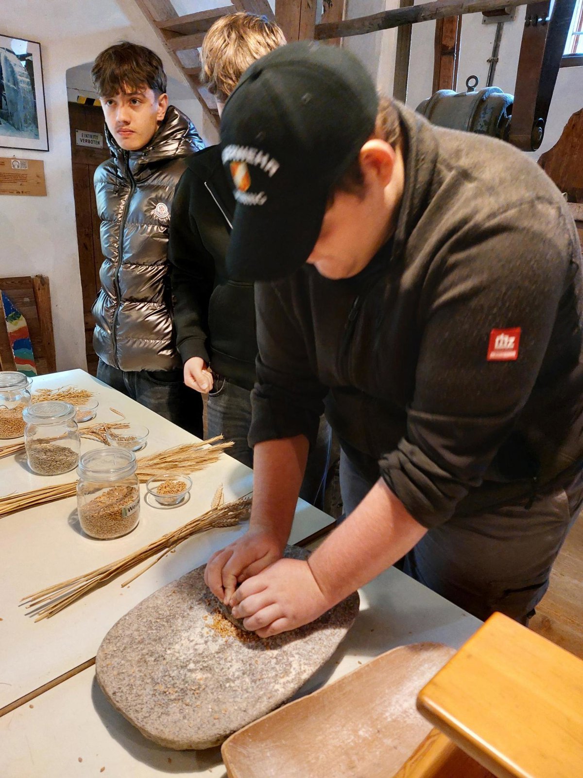In der historischen Mühleneinrichtung durften wir den Weg vom Korn des Mahlbauern zum Brot nachvollziehen. Mitglieder des Kulturvereins Furthmühle in Pram boten einen interessanten Stationenbetrieb in Kleingruppen an: Holzstäbe wurden auf historischen „Hoanzlbänken“ geschnitzt, „Zelten“ wurden am offenen Feuer gebacken und zuvor aus Teig selbst ausgewalkt, der legendäre Transmissionsriemen der Mühle wurde uns vorgeführt und schließlich wurden wir auf den „Mühlenbären“ hingewiesen. Mehl, Haferflocken und Grieß wurden auf vielfältige Weise per Hand erzeugt, Getreidesorten konnten bestimmt werden und zum Abschluss bekam jeder ein kleines Brieflein mit selbst erzeugtem Grieß und Mehl mit auf den Weg.