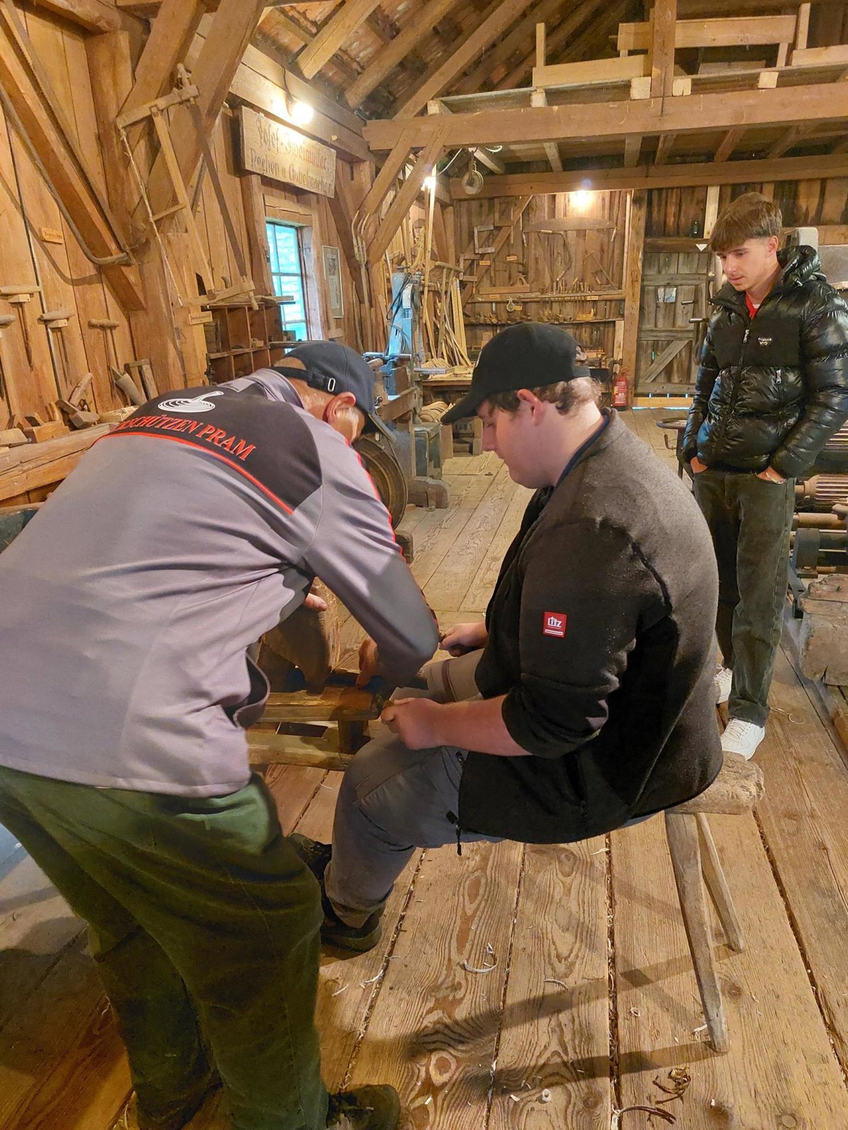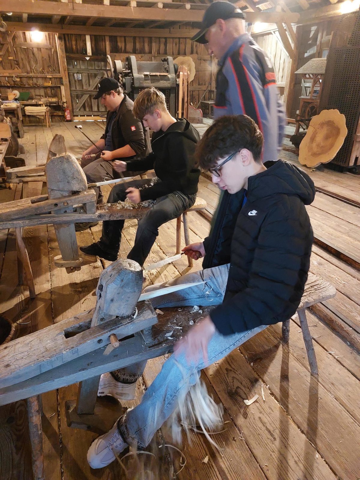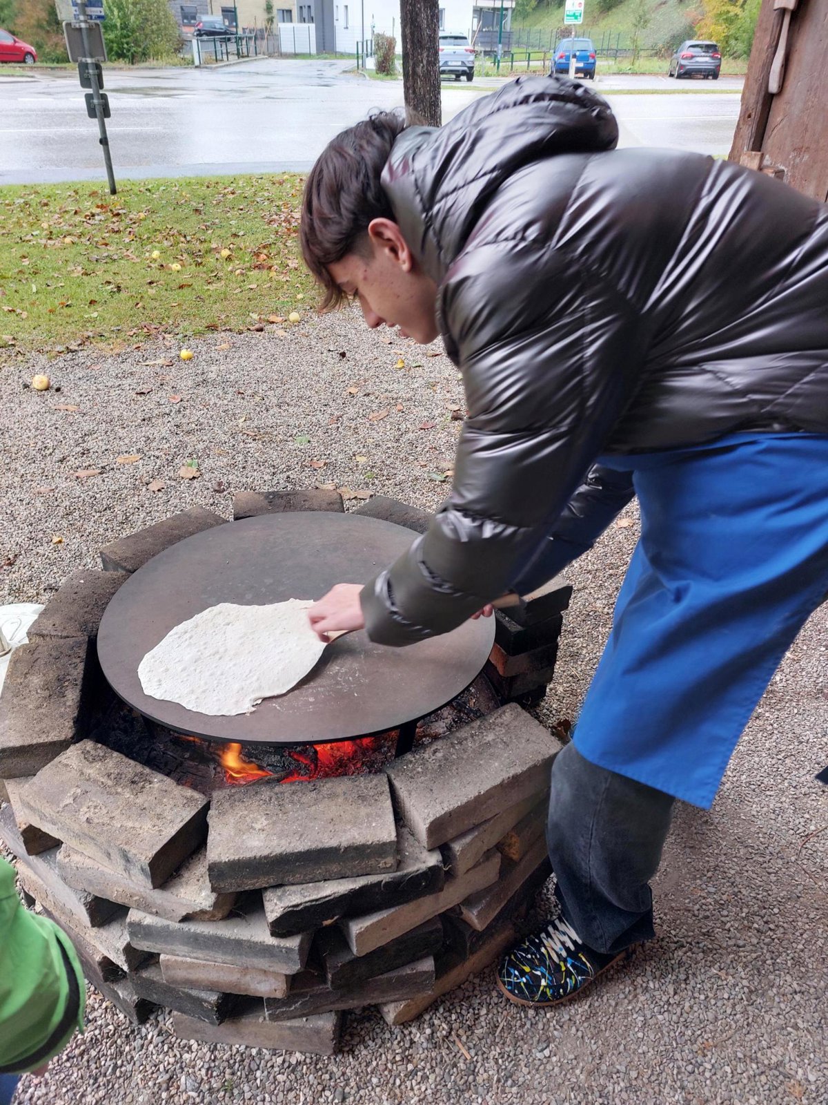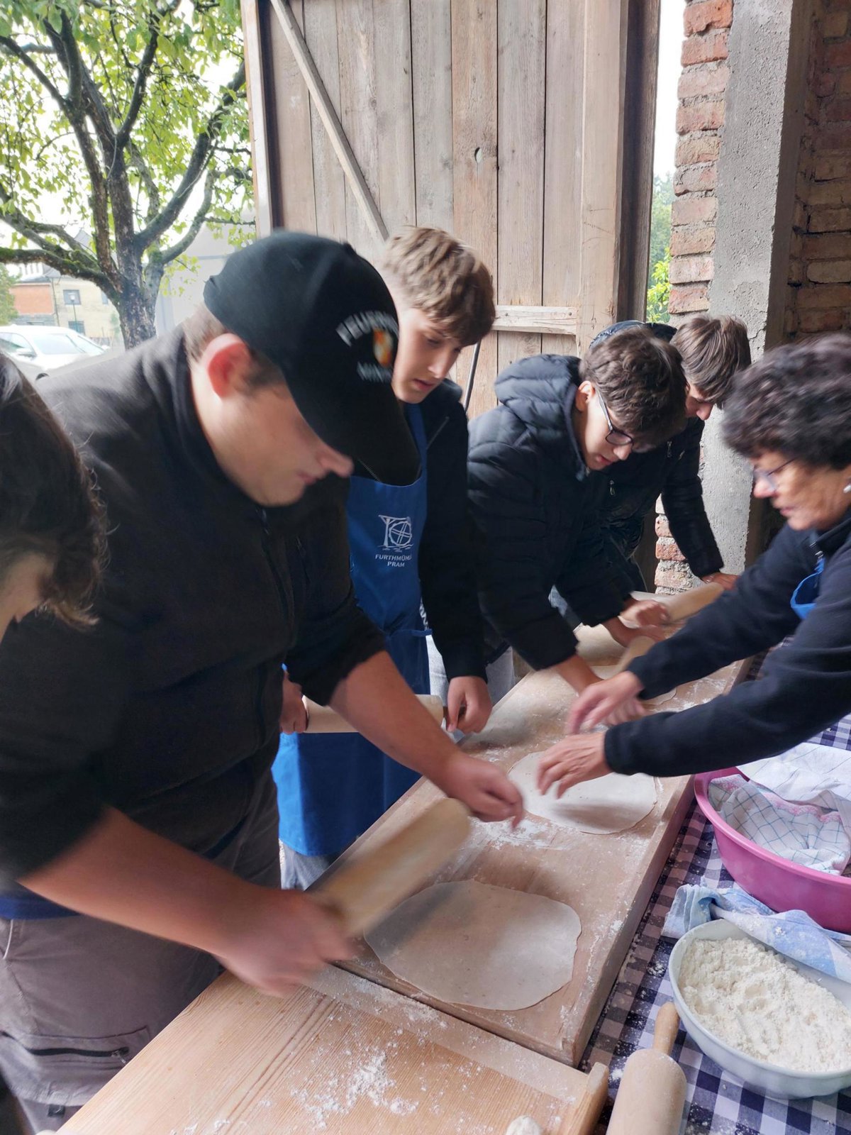 In der historischen Mühleneinrichtung durften wir den Weg vom Korn des Mahlbauern zum Brot nachvollziehen. Mitglieder des Kulturvereins Furthmühle in Pram boten einen interessanten Stationenbetrieb in Kleingruppen an: Holzstäbe wurden auf historischen „Hoanzlbänken“ geschnitzt, „Zelten“ wurden am offenen Feuer gebacken und zuvor aus Teig selbst ausgewalkt, der legendäre Transmissionsriemen der Mühle wurde uns vorgeführt und schließlich wurden wir auf den „Mühlenbären“ hingewiesen. Mehl, Haferflocken und Grieß wurden auf vielfältige Weise per Hand erzeugt, Getreidesorten konnten bestimmt werden und zum Abschluss bekam jeder ein kleines Brieflein mit selbst erzeugtem Grieß und Mehl mit auf den Weg.