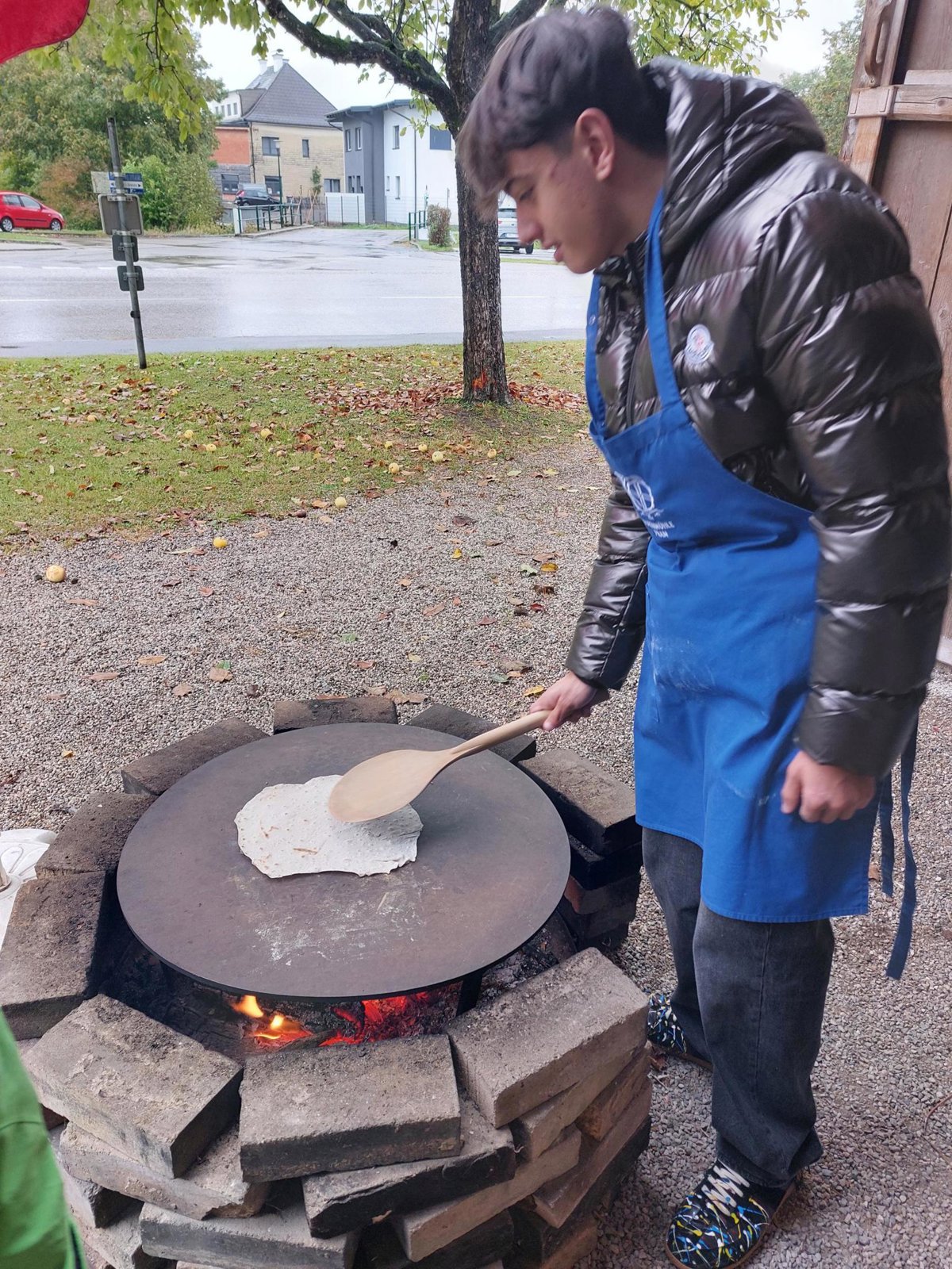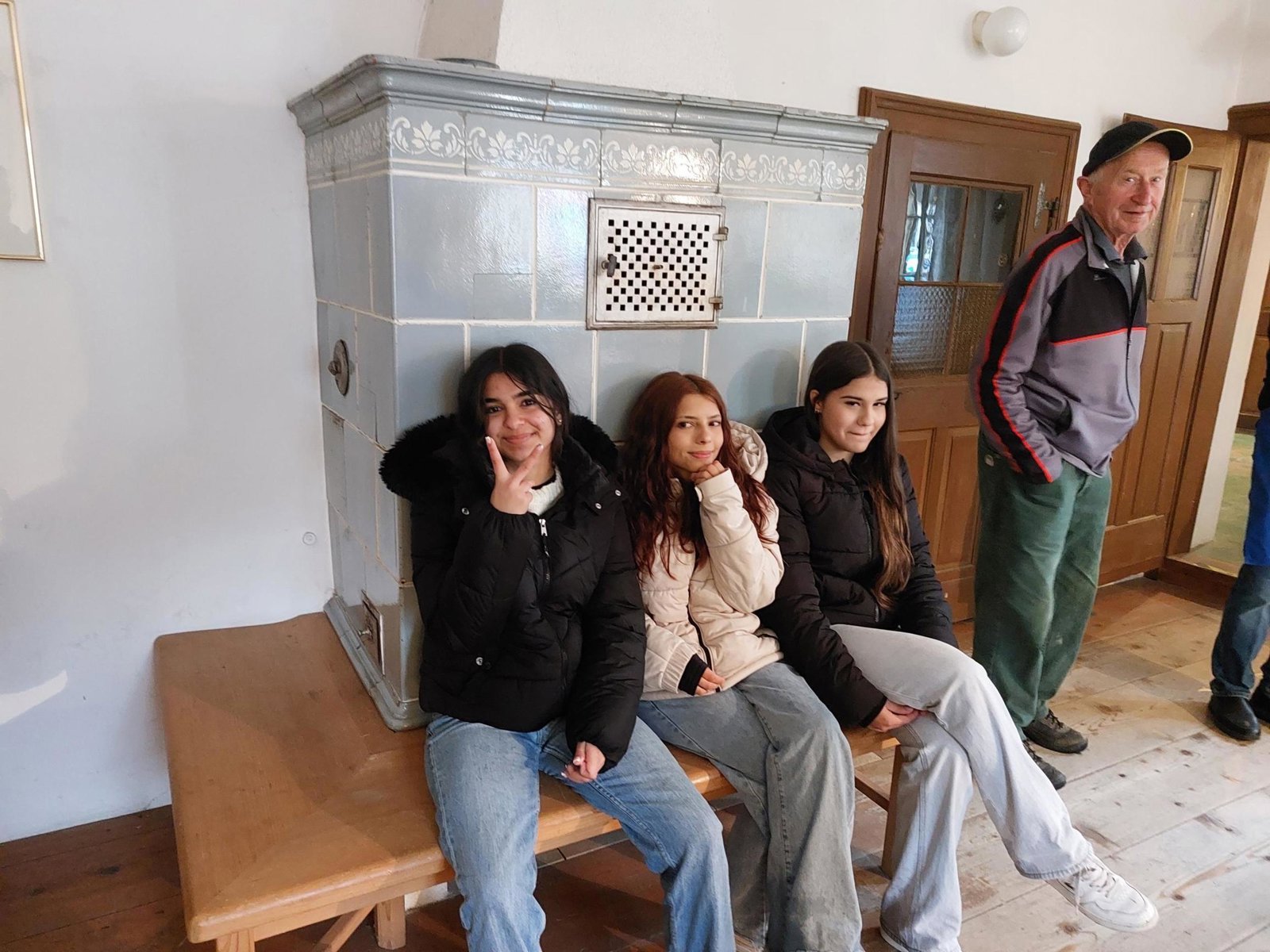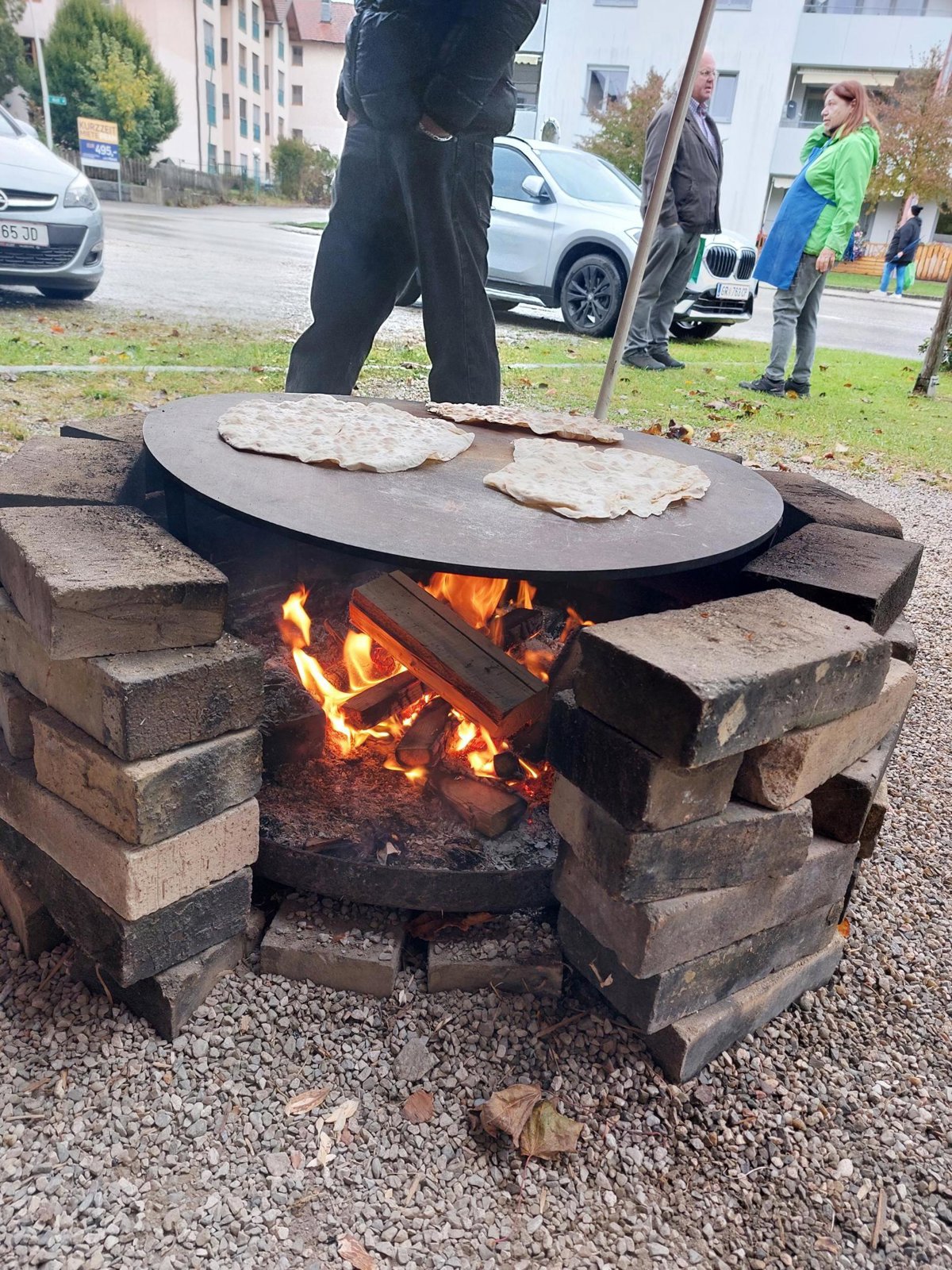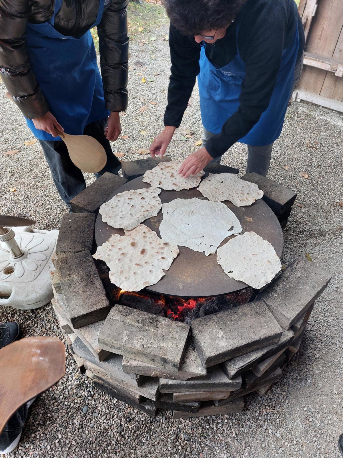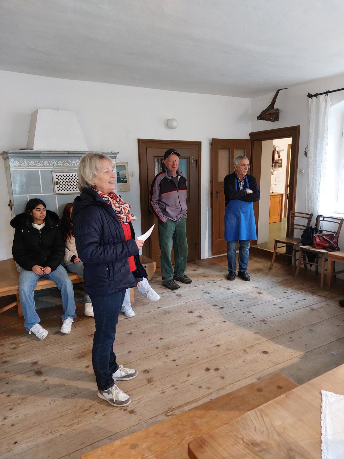 In der historischen Mühleneinrichtung durften wir den Weg vom Korn des Mahlbauern zum Brot nachvollziehen. Mitglieder des Kulturvereins Furthmühle in Pram boten einen interessanten Stationenbetrieb in Kleingruppen an: Holzstäbe wurden auf historischen „Hoanzlbänken“ geschnitzt, „Zelten“ wurden am offenen Feuer gebacken und zuvor aus Teig selbst ausgewalkt, der legendäre Transmissionsriemen der Mühle wurde uns vorgeführt und schließlich wurden wir auf den „Mühlenbären“ hingewiesen. Mehl, Haferflocken und Grieß wurden auf vielfältige Weise per Hand erzeugt, Getreidesorten konnten bestimmt werden und zum Abschluss bekam jeder ein kleines Brieflein mit selbst erzeugtem Grieß und Mehl mit auf den Weg.
