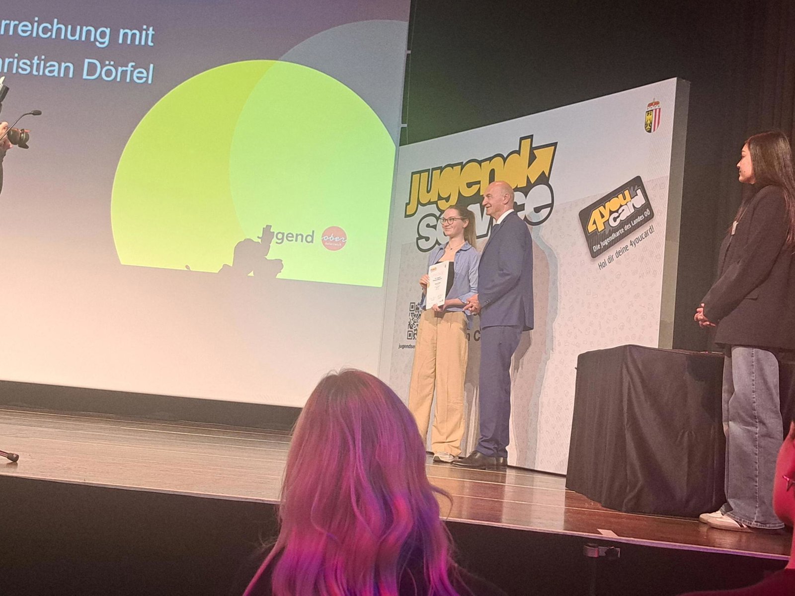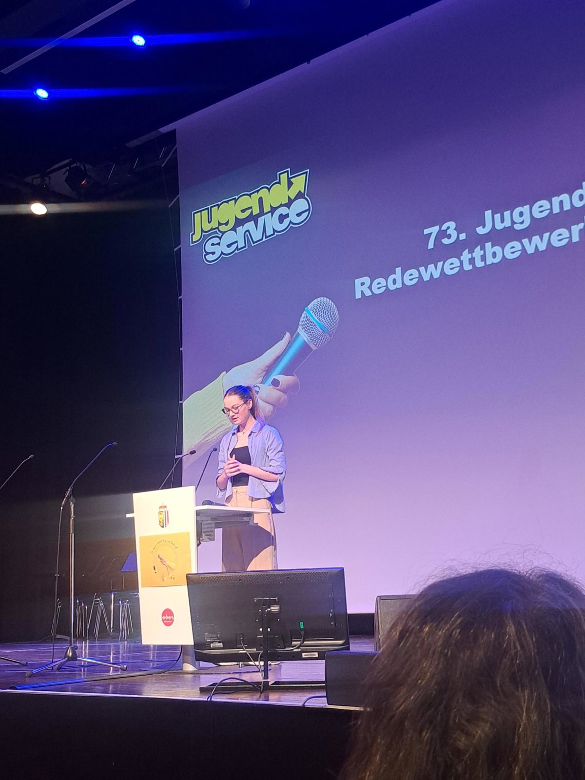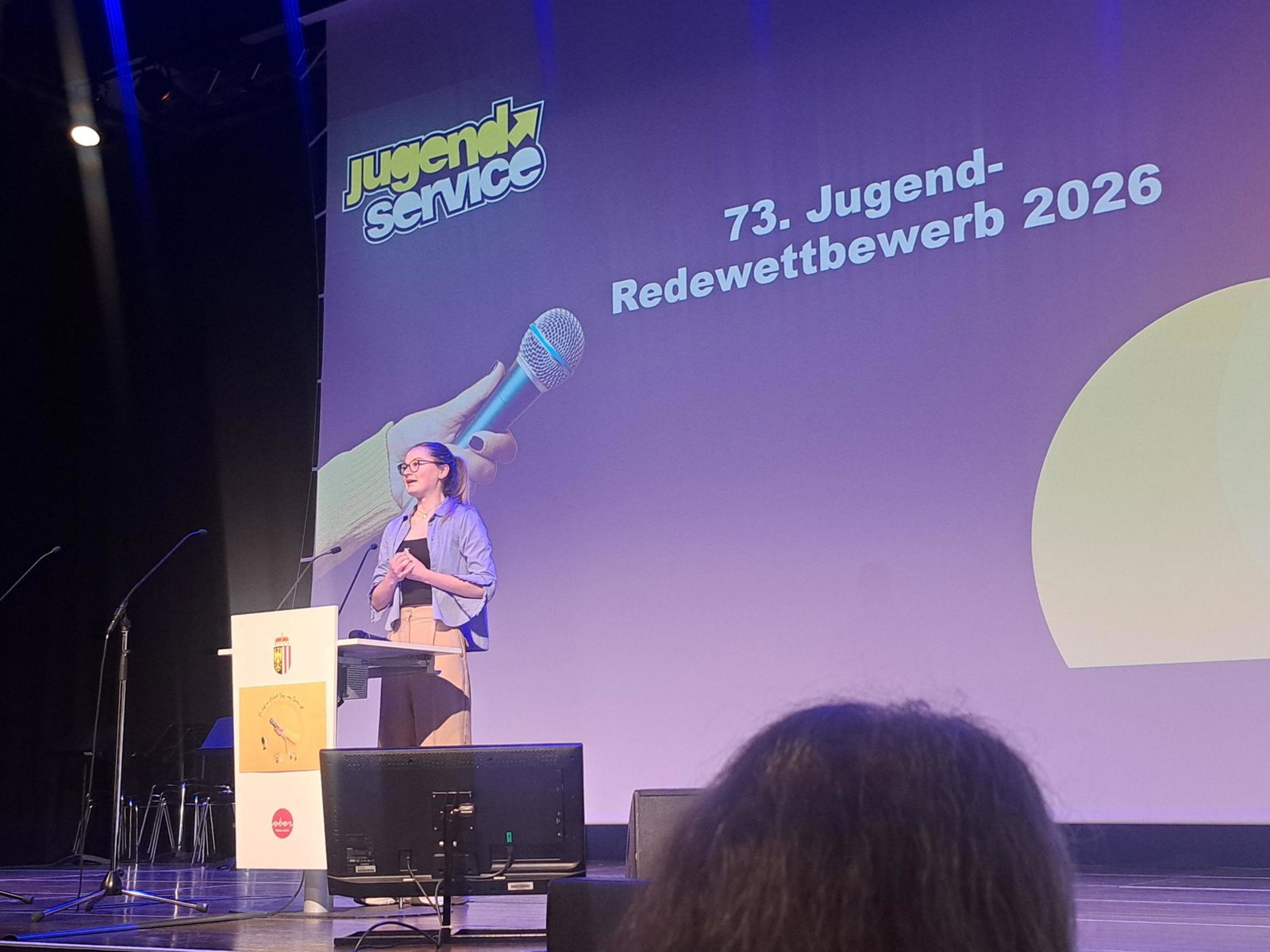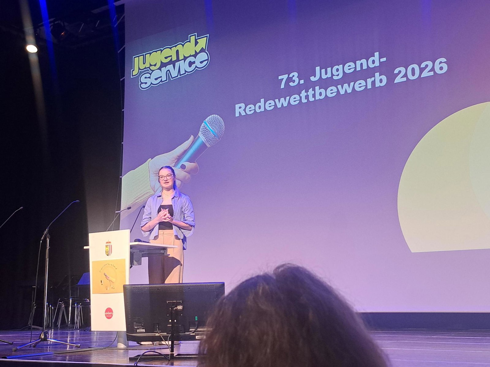 Mit ihrer überzeugenden Bühnenpräsenz und einer energischen Rede begeisterte sie die Jury und sicherte sich den hervorragenden 2. Platz. Die Urkunde wurde ihr von Jugend-Landesrat Dr. Dörfel überreicht.